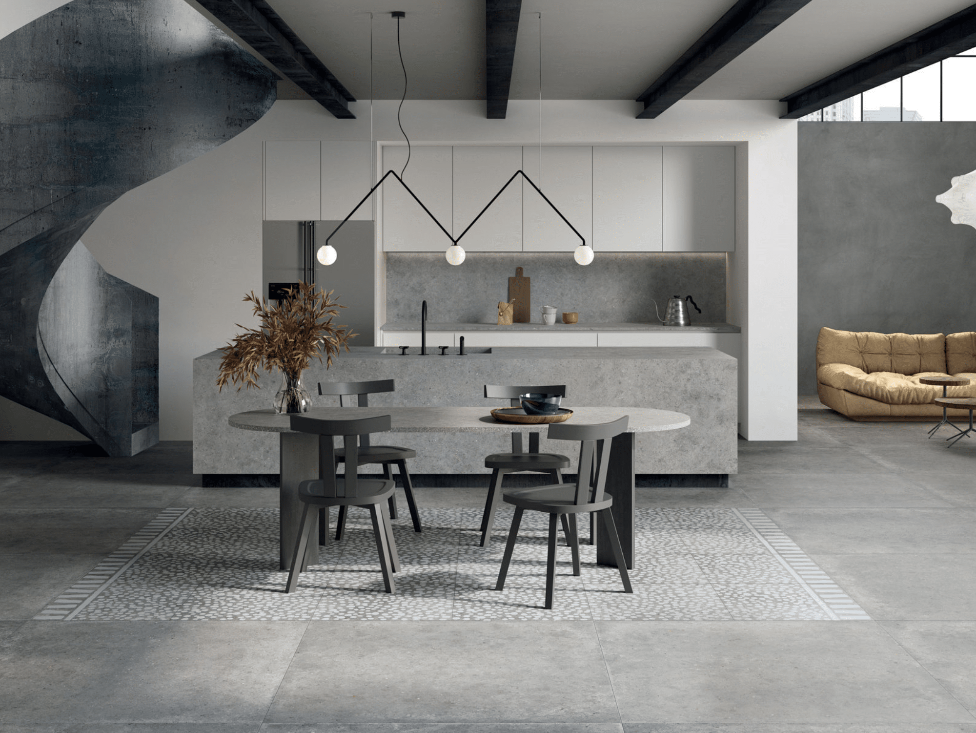 Le carrelage imitation béton est à la fois traditionnel et contemporain. Nous pouvons le marier avec des aspects bois, marbre ou pierre. Il se décline dans différentes couleurs et nuances : béton blanc, béton gris, béton gris clair.